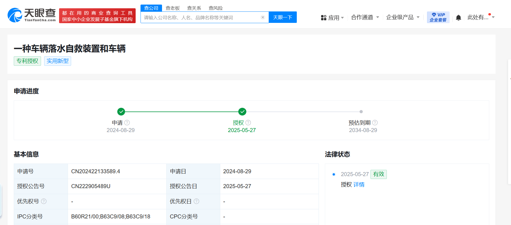 近日,赛力斯汽车有限公司申请的“一种车辆落水自救装置和车辆”专利获授权。
