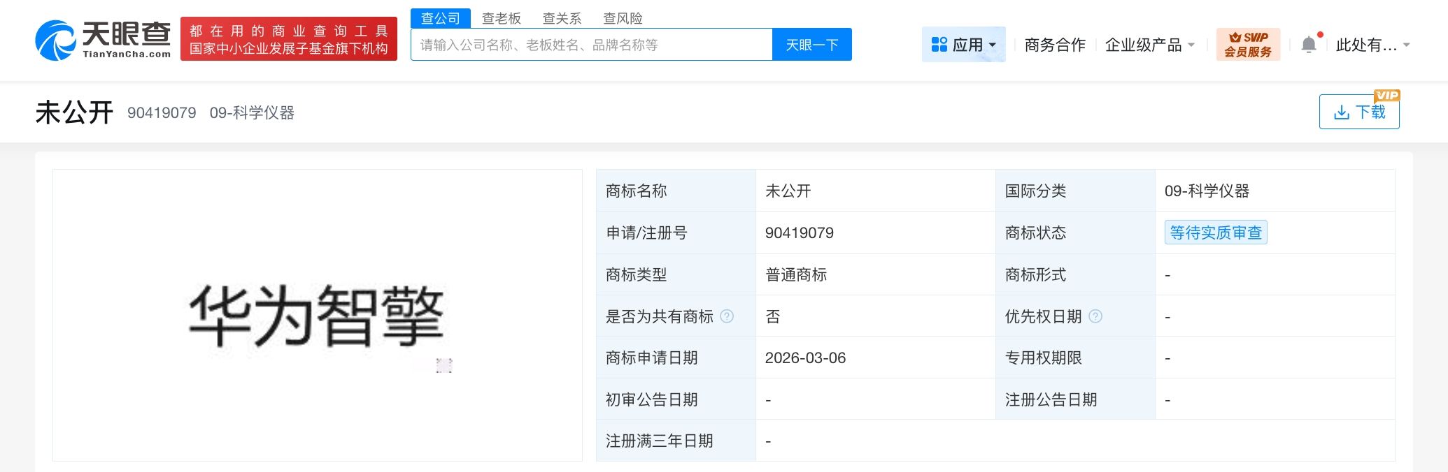 天眼查知识产权信息显示,近日,华为技术有限公司申请注册一枚“华为智擎”商标,国际分类为科学仪器,当前商标状态为等待实质审查。