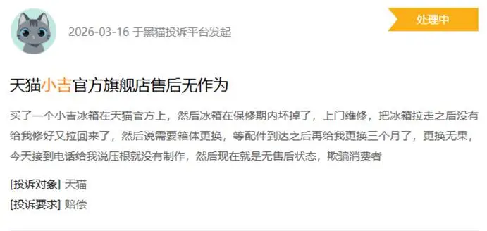 有消费者投诉称:“在天猫官方买了一个小吉冰箱,然后在保修期内坏了之后去上门维修,把冰箱拉走后没有修好又拉了回来,后来被告知需要更换箱体,等配件到货后再更换三个月都没有成功更换,现在就处于无售后状态……”