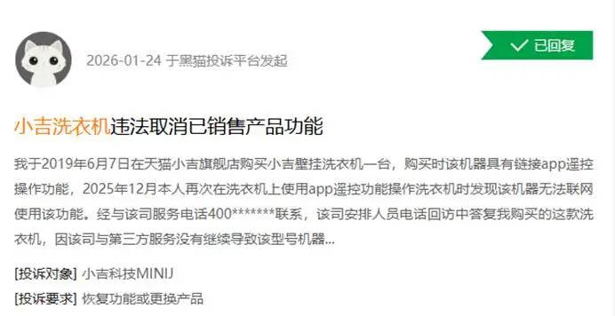 在黑猫平台上,一位用户反映自己2019年6月从小吉天猫旗舰店购买的壁挂式洗衣机当时有APP遥控功能,但是到2025年12月发现这个功能已经无法使用了。经联系客服后得知,由于与第三方服务商的合作关系终止,该型号的洗衣机不能联网,功能也不能恢复。