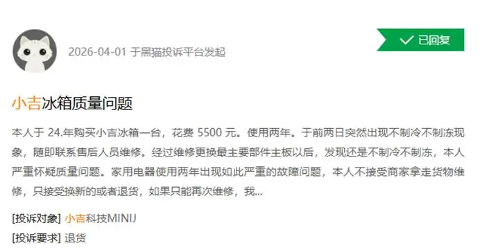 小吉电器正在描绘高端蓝图的时候,现实给了它重重一击。2026年4月,多家媒体报道了消费者投诉事件,小吉电器遭遇了严重的信任危机。