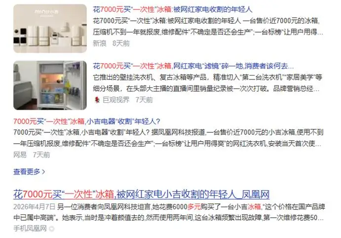 可是另一边,一股“颜值大于品质”的舆论风潮爆发。从媒体曝光的一次性冰箱7000元,到服务终止导致冰箱智能功能失效投诉,消费者的不满声浪正在拷问小吉电器高端品牌的立身之本。