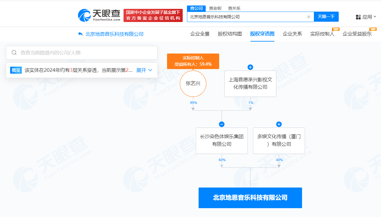 该公司成立于2022年4月,法定代表人为李鹏飞,注册资本200万人民币。股权全景穿透图显示,该公司由长沙染色体娱乐集团有限公司持股60%,后者由张艺兴持股99%。