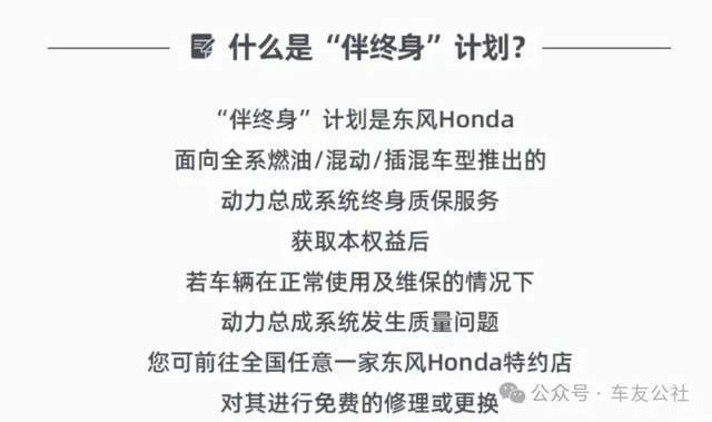 据悉,东风本田于2025年10月18日正式发布“伴终身”动力总成终身质保服务,作为面向全系燃油、混动、插混车型推出的服务,其宣称突破了传统质保的时间限制,实现从“有限保障”到“终身守护”的跨越。根据官方宣传,该质保覆盖发动机、变速箱、动力蓄电池等动力总成核心部件,在规定范围内,车辆相关部件出现质量问题,用户可在全国任意东风本田特约店享受免费修理及更换服务。