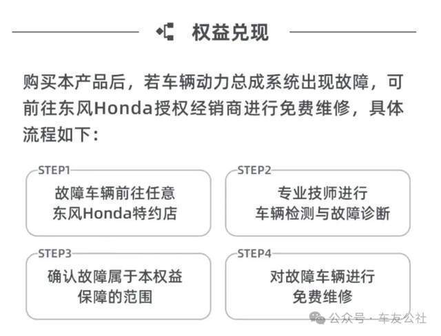 同时官方也标注了权益享受条件:车辆需为非运营性质的首任车主,车龄在5年16万公里以内(EV车除外),购买前车辆动力总成需无故障且相关维修均在授权经销商处完成,超整车质保期的车辆还需满足相应保养次数要求。东风本田还在宣传中表示,推出该服务是源于对自身品质的绝对自信,更是央企责任与担当的体现。