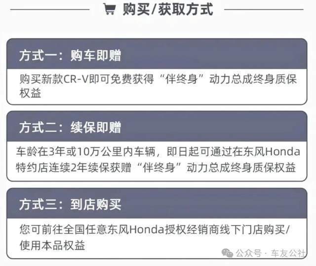 官方明确了三种“伴终身”权益获取方式,其中最直接的便是“购车即送”——购买新款CR-V即可免费获得该权益;此外,车龄3年或10万公里内的车辆,连续2年在特约店续保可获赠;用户也可直接到线下授权经销商门店购买。