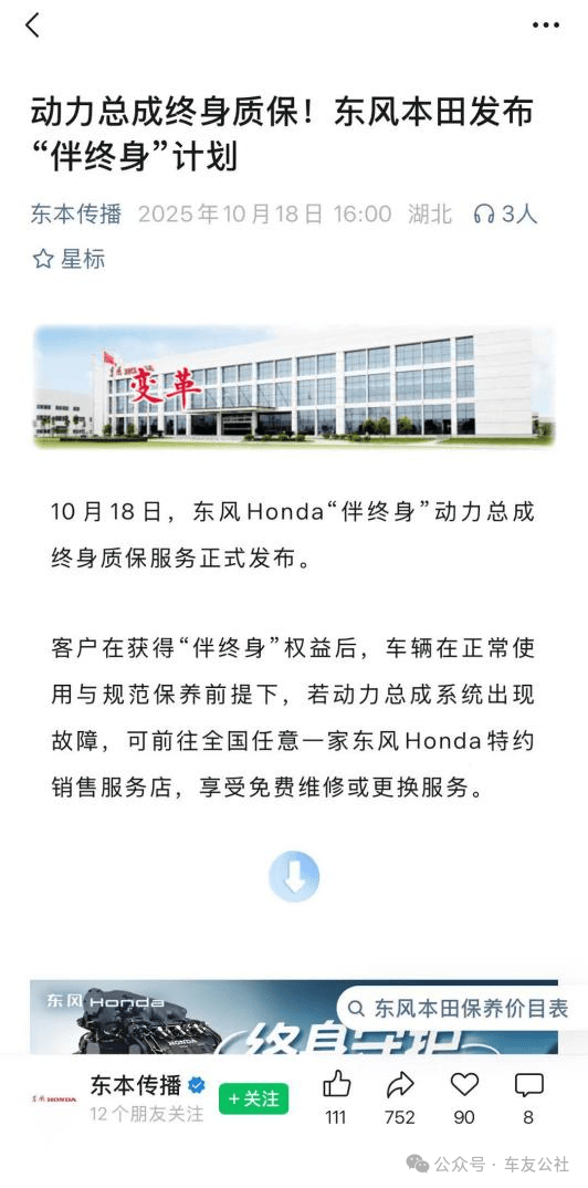 但车友公社在名为“东本传播”的微信公众号(认证名称:东风本田汽车有限公司)上,依然能够查阅到2025年10月18日发布的《动力总成终身质保!东风本田发布"伴终身"计划》文章中,明确标注了前文所述的“伴终身”计划的详细规则,但通篇并未标注该权益的结束时间。值得注意的是,该文章有7000+阅读量及750+的转发量。