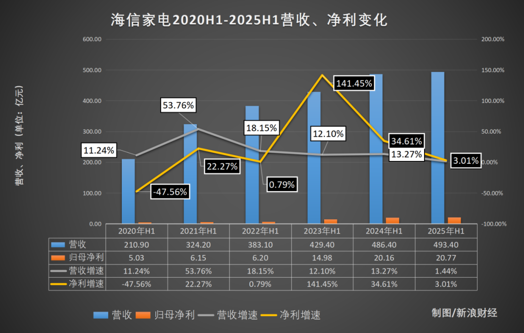 近日,海信家电发布2025年上半年业绩报告。上半年,海信家电营收493.4亿元,同比增长1.44%;同期,公司归母净利润20.77亿元,同比增长3.01%。这是海信家电近6年来,半年报发布营收增速最低的一次,也是近三年归母净利增速最低的一次。