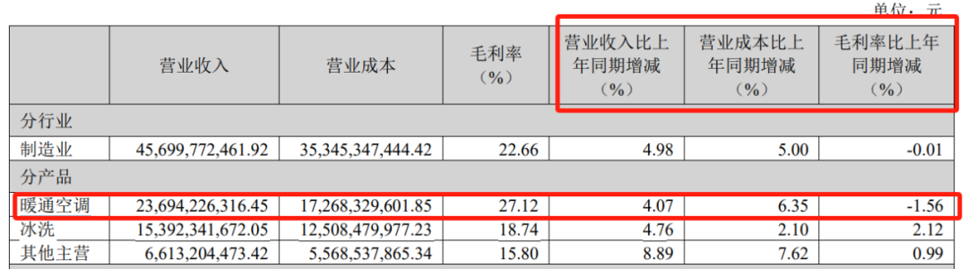 具体到业务层面,海信家电最为核心——上半年贡献了48.02%总营收占比的暖通空调业务,营收增速为4.07%,较去年同期的7.59%有所减缓;由于营业成本的提升,今年上半年,暖通空调产品毛利较去年同期下滑了1.56%。