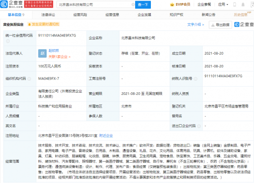 【TechWeb】企查查APP显示,8月20日,北京昌米科技有限公司成立,法定代表人为赵欣然,注册资本100万元人民币,经营范围包含:出版物批发;第三类医疗器械经营;药品零售;销售(含网上销售)汽车零配件、自行车、摩托车(不含三轮摩托车)等。