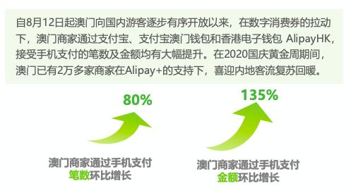 在2020国庆黄金周期间,澳门已有2万多家商家在Alipay+的支持下,喜迎内地客流复苏回暖。