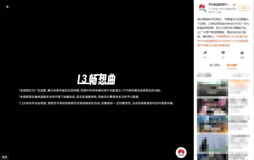 在宣传片的片头,华为方面虽已明确表示“本视频仅为广告创意,不代表车辆当前具有实际功能”,并提醒“若实际道路使用,驾驶员仍需保持关注并予以接管”,但这样的说明似乎并未能平息公众的怒火。许多网友质疑,这样的宣传片是否构成了夸大宣传,甚至是虚假宣传,误导了消费者对自动驾驶技术的认知。