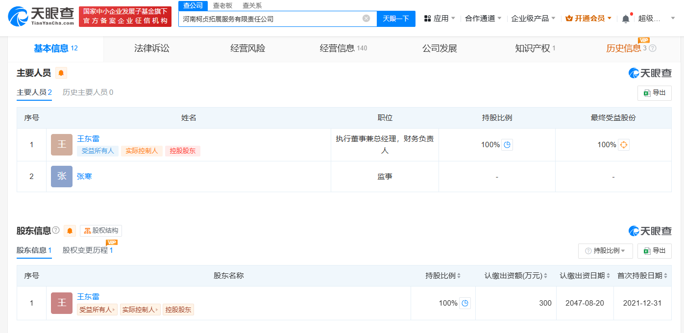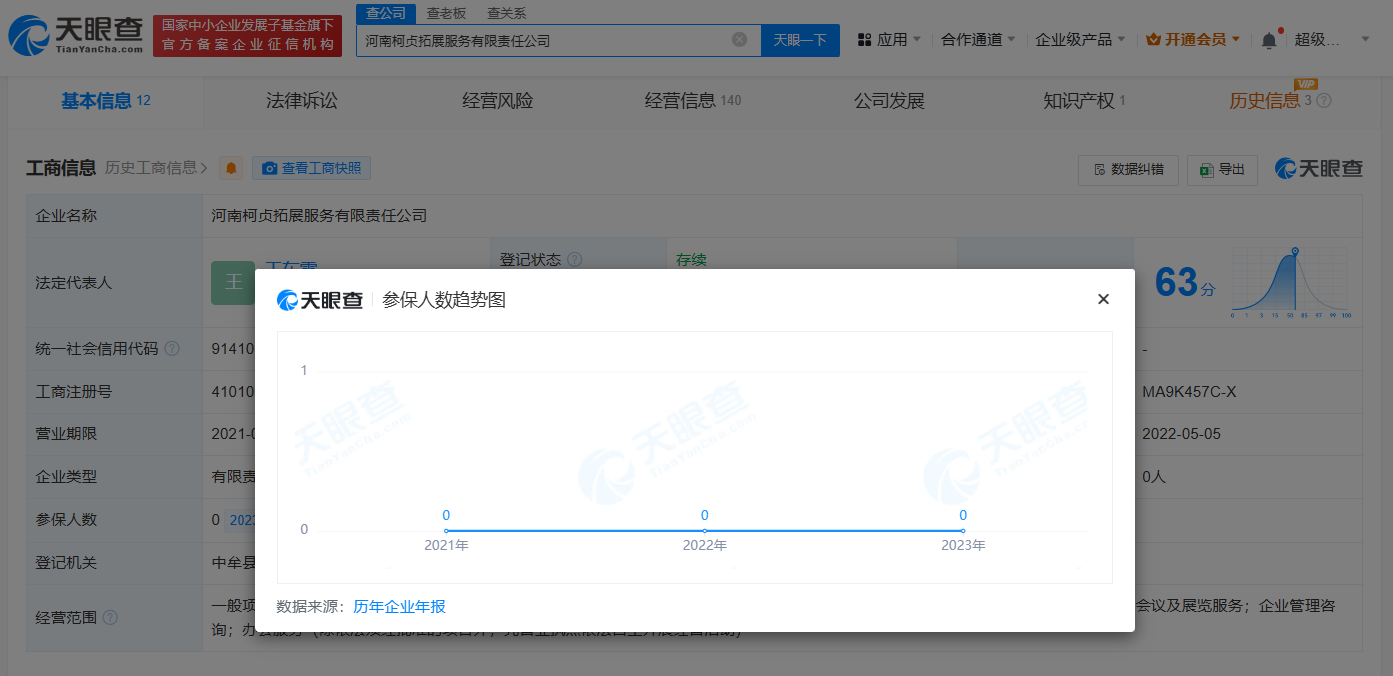 天眼查App显示,涉事的河南柯贞拓展服务有限责任公司成立于2021年8月,法定代表人为王东雷,注册资本300万人民币,经营范围包括体验式拓展活动及策划、体育赛事策划、体育保障组织、教育咨询服务等,由王东雷全资持股。年报信息显示,该公司2021年、2022年、2023年参保人数均为0。