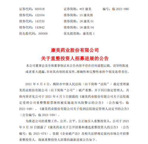 目前,*ST康美已经进入破产重整程序。在披露并案审理决定书的同时,*ST康美还公布了重整投资人招募进展。