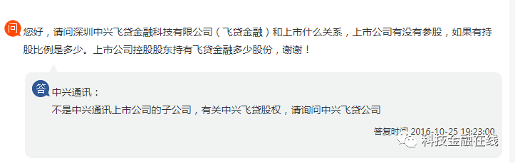 也正是凭借这一关系,飞贷将自己冠以“中兴”字样。曾经有投资人向中兴通讯询问中兴飞贷是否与其有关,中兴通讯回复称中兴飞贷不是其子公司。