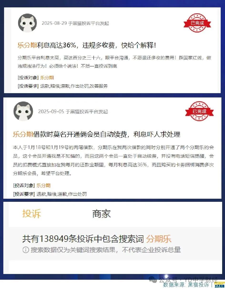 黑猫投诉平台上,有用户反映,乐信旗下的分期乐合同标注利率看似不高,但叠加担保费、服务费后,实际综合年化利率远超最高人民法院规定的24%司法保护上限。中国裁判文书网上的相关案例也证实,部分借款人承担的综合费率高于24%。此外还有用户投诉称,在未经其同意的情况下开通了会员并自动续费。
