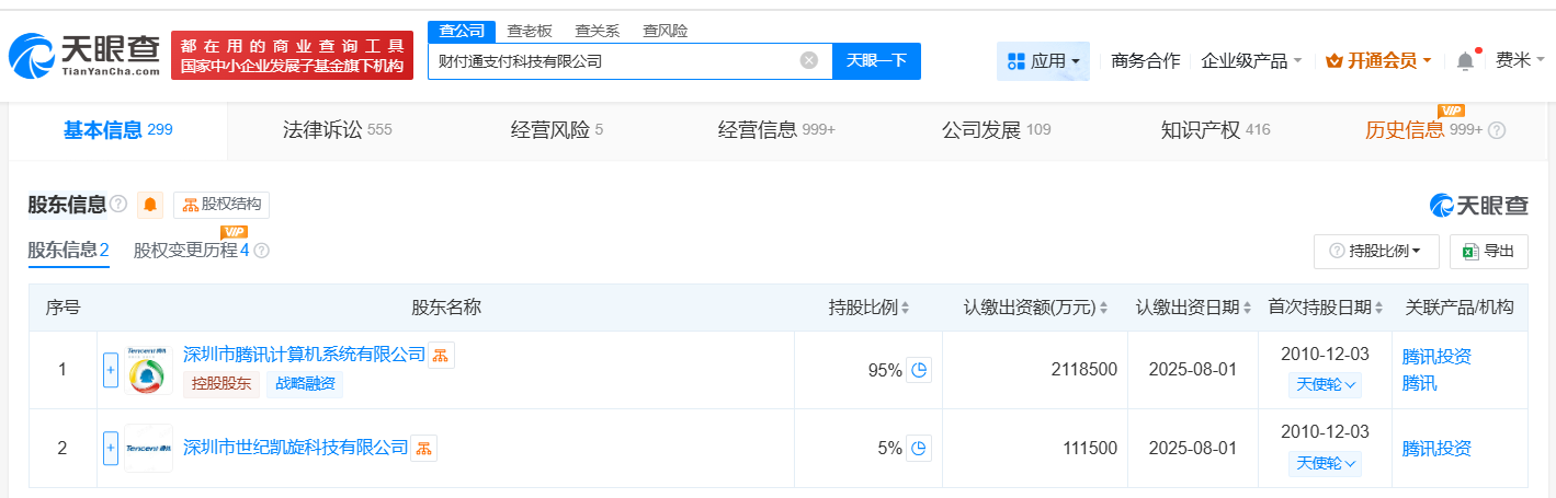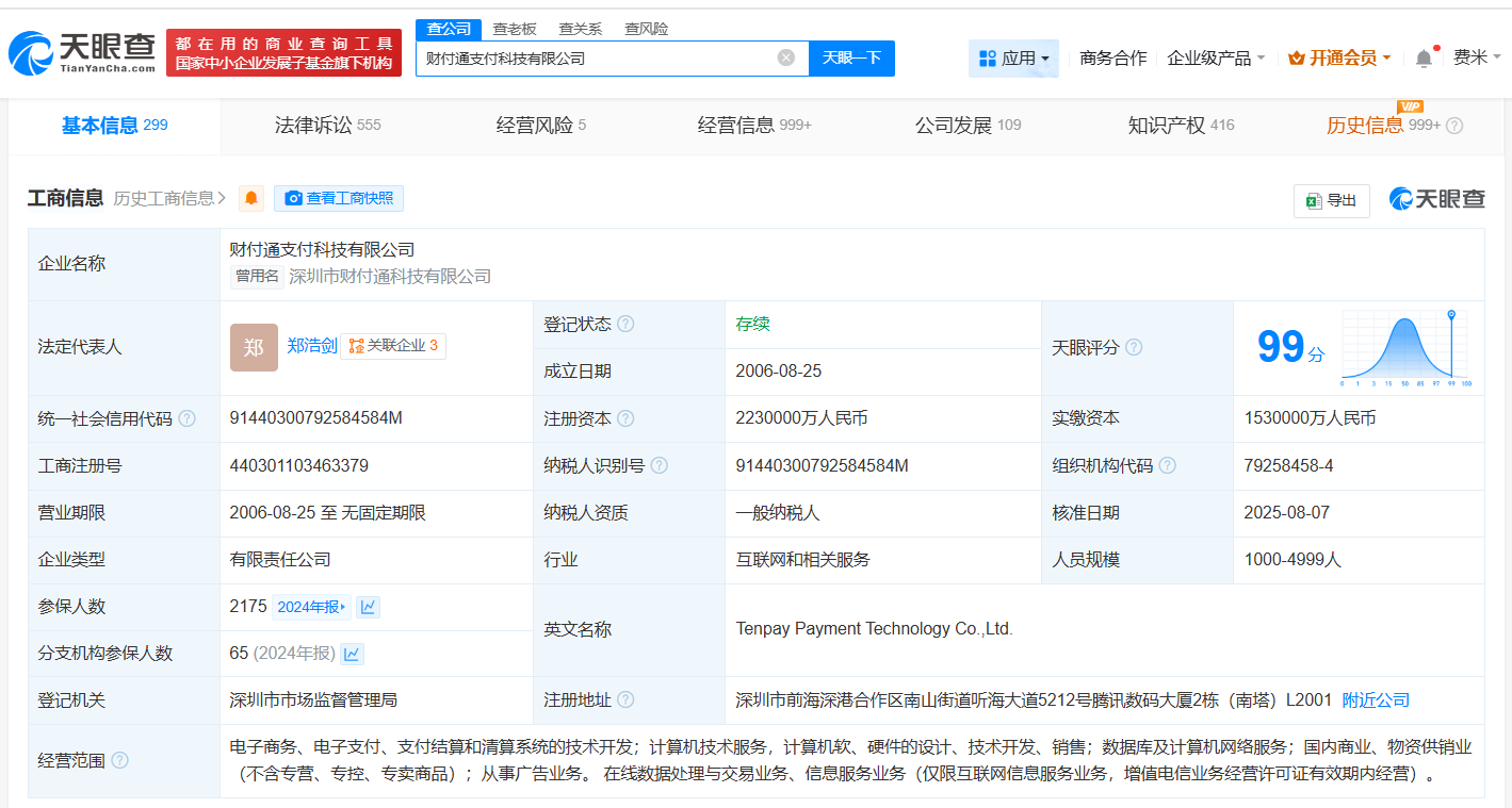 该公司成立于2006年8月,法定代表人为郑浩剑,经营范围包括电子商务、电子支付、支付结算和清算系统的技术开发等。股东信息显示,该公司由深圳市腾讯计算机系统有限公司、深圳市世纪凯旋科技有限公司共同持股。