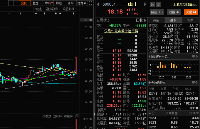 今日工程机械股集体爆发,其中,低迷了许久的行业龙头三一重工尾盘涨停,全天成交额63.83亿元,最新股价18.18元/股。该股今日获得主力资金净流入高达17.3亿元,位居两市第一。