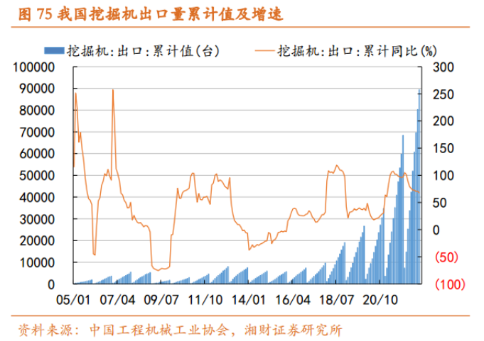 一个标志性的事件是,2022年9月,我国挖掘机出口10667台,同比增长73.3%。占总销量比重提升至50%以上。1-9月,出口总销量80306台,同比增长70.5%。9月份也是我国首次挖掘机出口量大于国内销量。叠加最新出炉的2022年全年销量数据,出口有望成为工程机械公司的“制胜法宝”。