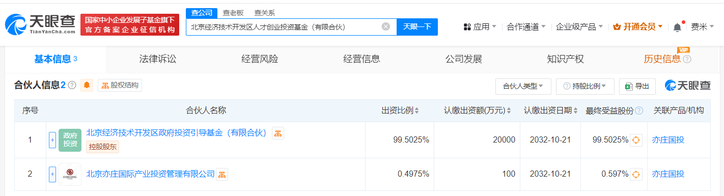天眼查App显示,近日,北京经济技术开发区人才创业投资基金(有限合伙)成立,执行事务合伙人为北京亦庄国际产业投资管理有限公司,出资额2.01亿人民币,经营范围为创业投资,以私募基金从事股权投资、投资管理、资产管理等活动。合伙人信息显示,该基金由北京经济技术开发区政府投资引导基金(有限合伙)、北京亦庄国际产业投资管理有限公司共同出资。