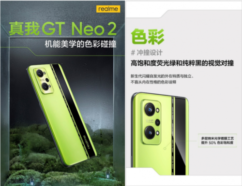 据realme官方最新发布的预热海报显示,与此前曝光的消息基本一致,全新的realme真我GTNeo2采用了全新的“黑薄荷”设计,将行业最高饱和度的荧光绿与纯粹黑产生极致的视觉对撞,使其在千篇一律的手机色彩中脱颖而出,在不同材质叠加下,诠释了机能美学设计的精髓。而在机身正面,该机将采用一块6.6英寸挖孔全面屏,采用三星E4发光材料,分辨率为2400*1080,支持120Hz超高刷新率;前置摄像头开孔位于屏幕左上角。