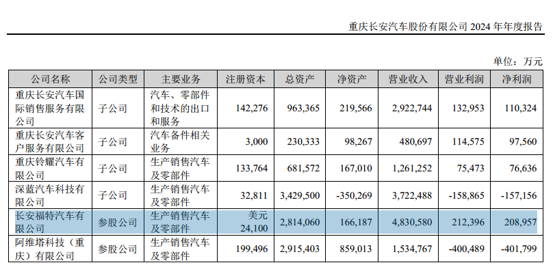 长安汽车在2024年年报中介绍,截至2024年期末,长安福特总资产达281.41亿元,净资产达16.62亿元。