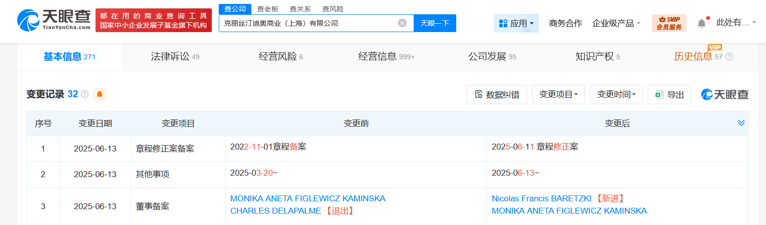 天眼查工商信息显示,迪奥中国关联公司克丽丝汀迪奥商业(上海)有限公司成立于2005年9月,法定代表人为TRUNG HIEN TRAN,注册资本1亿人民币,经营范围含出版物零售、食品销售、酒类经营、餐饮服务、服装服饰零售、服装服饰批发、鞋帽批发、珠宝首饰零售等。股东信息显示,该公司由CHRISTIAN DIOR FAR EAST LIMITED全资持股。分支机构信息显示,该公司的62家分支机构中,有49家为存续或开业状态,其余13家分支机构已注销。天眼风险信息显示,该公司曾涉及多起法律纠纷,案由包括信息网络买卖合同纠纷、劳动合同纠纷等。值得一提的是,今年6月,该公司发生工商变更,CHARLES DELAPALME卸任董事,新增Nicolas Francis BARETZKI为董事。