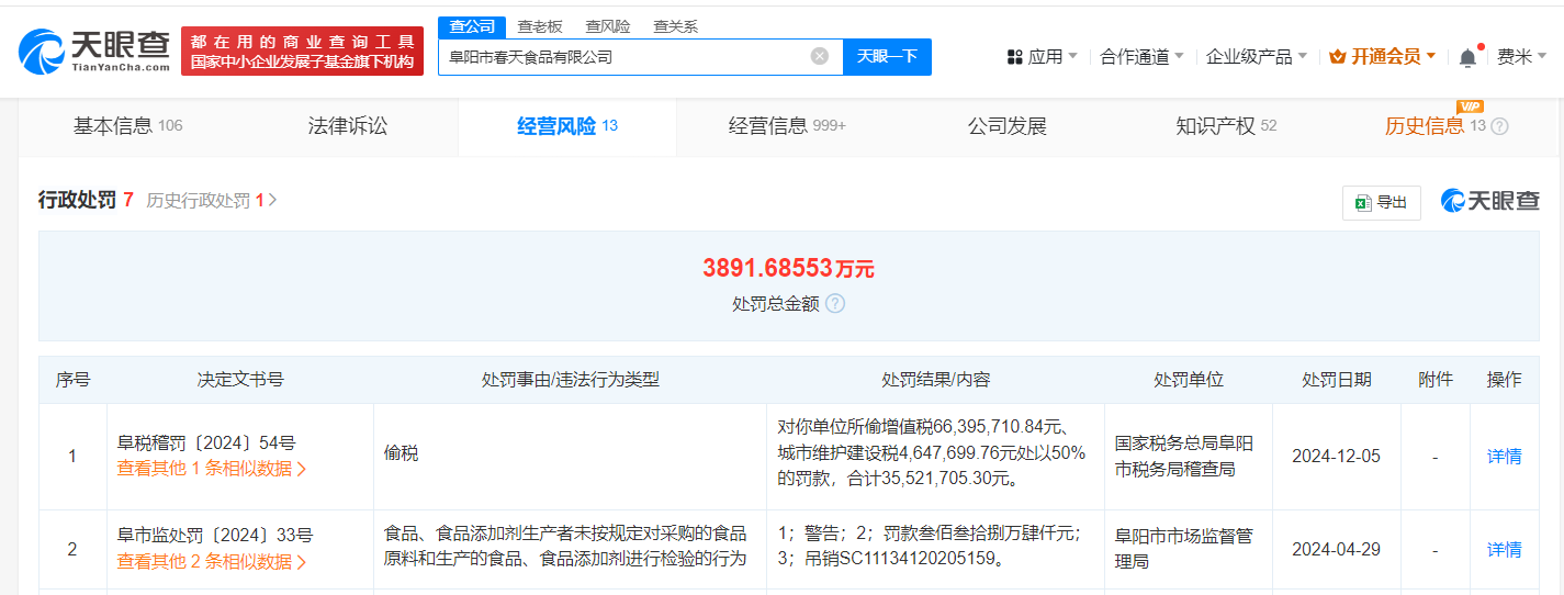 此外,315曝光的阜阳市春天食品有限公司于2024年4月因食品、食品添加剂生产者未按规定对采购的食品原料和生产的食品、食品添加剂进行检验,被阜阳市市场监督管理局罚款百万余元,并吊销公司《食品生产许可证》,被列入严重违法失信企业名单。