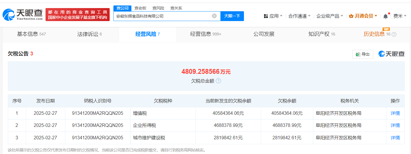 值得一提的是,近日,安徽东辉食品科技有限公司新增3条欠税公告信息,欠税税种为增值税、城市维护建设税、企业所得税,欠税余额合计4809万余元。阜阳市春天食品有限公司新增3条欠税公告信息,欠税税种为增值税、城市维护建设税、企业所得税,欠税余额合计7909万余元。安徽厨先生食品有限公司新增3条欠税公告信息,欠税税种为增值税、城市维护建设税、企业所得税,欠税余额合计987万余元。