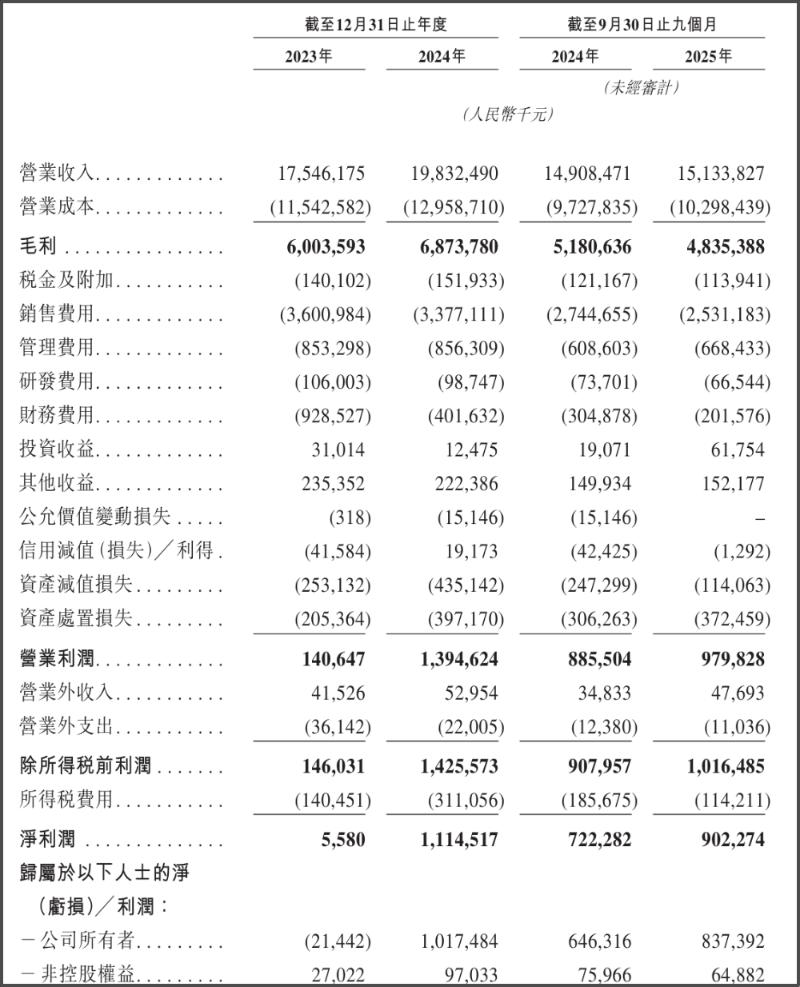 财务数据方面,招股书显示,该公司营收从2023年的175.46亿元增至2024年的198.32亿元,同比增长13.0%;截至2025年9月30日止9个月,营收为151.34亿元,同比增长1.5%;归母净利润从2023年的-0.21亿元增长至2024年的10.17亿元,2025年前9个月进一步达到8.37亿元。