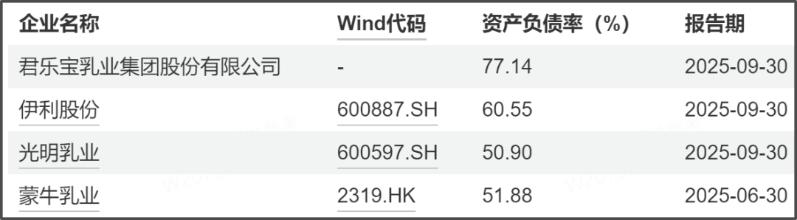 盈利增长的同时,君乐宝的资产负债率也长期处于高位。截至2025年9月末,该公司的资产负债率为77.14%,较2023年末的80.47%及2024年末的78.58%呈持续下降趋势,但仍远高于蒙牛乳业(51.88%,2025年6月末数据)及光明乳业(50.90%),也明显高于伊利股份(60.55%)。