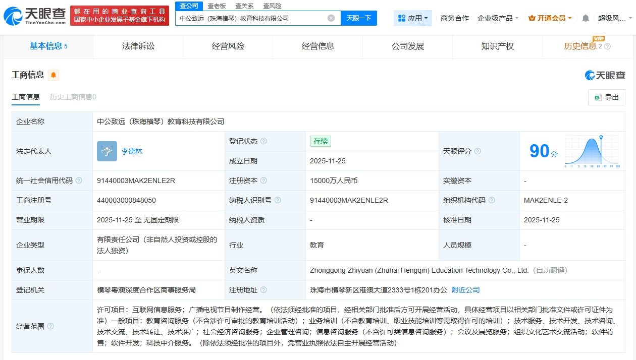 近日,中公致远(珠海横琴)教育科技有限公司成立,法定代表人为李德林,注册资本1.5亿人民币,经营范围包括互联网信息服务、广播电视节目制作经营、教育咨询服务、会议及展览服务、组织文化艺术交流活动等。