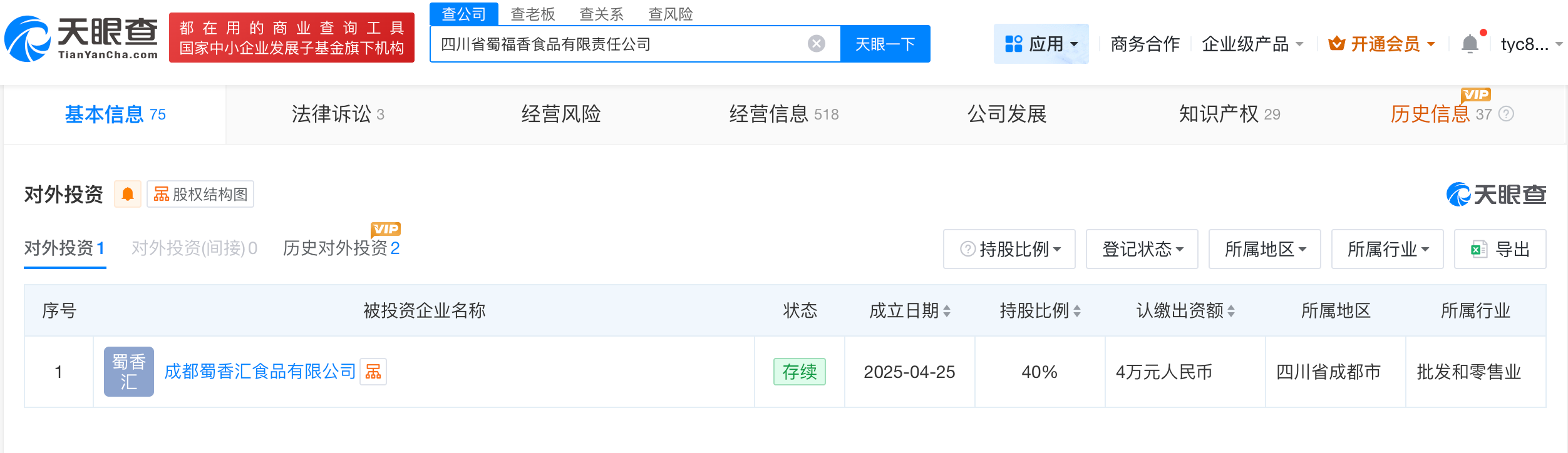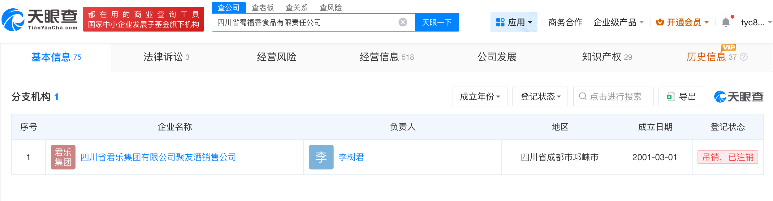 天眼查App显示,四川省蜀福香食品有限责任公司成立于1997年12月,法定代表人为王立群,注册资本2380万人民币,经营范围包括食品生产、食品销售、餐饮服务等,由成都市众兴食品有限公司、四川省荣盛泰集团有限责任公司共同持股。分支机构信息显示,该公司旗下四川省君乐集团有限公司聚友酒销售公司曾被吊销,目前处于注销状态。对外投资信息显示,去年4月,该公司对外投资了1家成都蜀香汇食品有限公司。