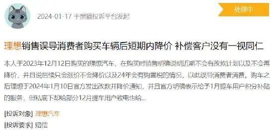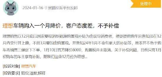 今年1月19日,福建的李女士(化名)表示,自己于2023年12月12日购买理想L7 Pro时,销售明确表示近期都不会有改款计划,也不存在降价的情况,甚至表示后续只会涨价,以及24年国家要取消新能源购置税补贴。