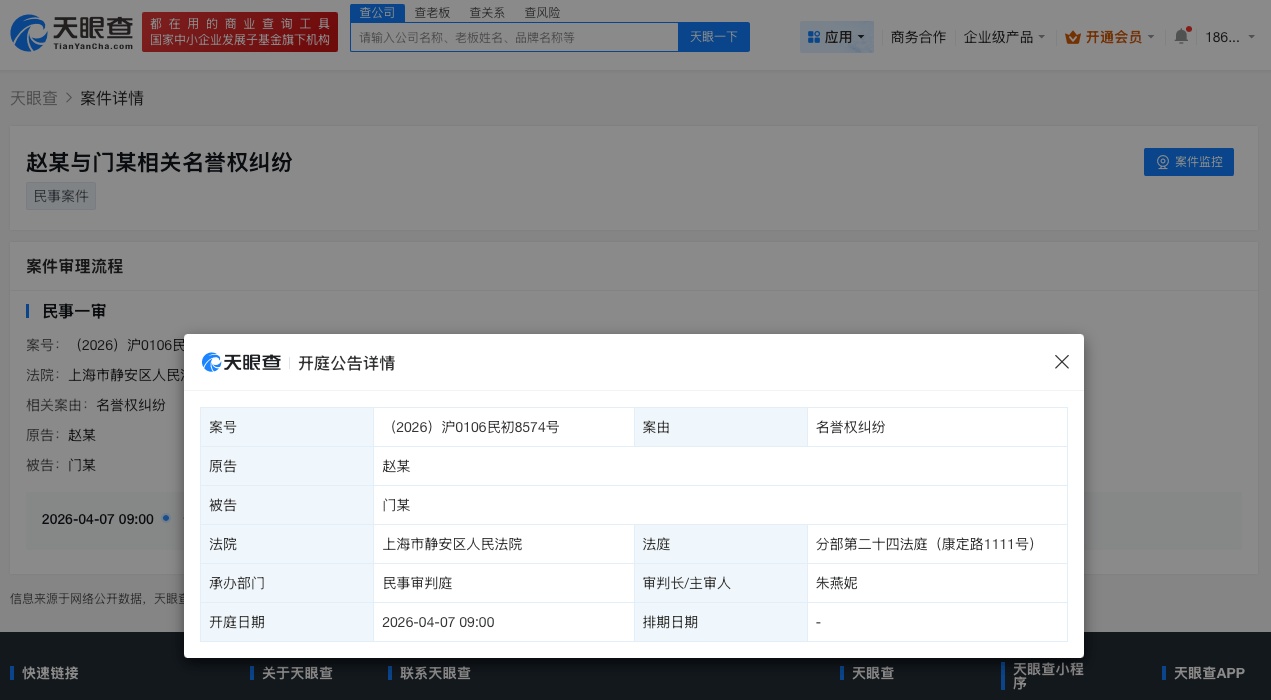 天眼查天眼风险信息显示,近日,赵丽颖与门某相关名誉权纠纷案件新增开庭公告,原告为赵丽颖,该案将于4月7日在上海市静安区人民法院开庭审理。
