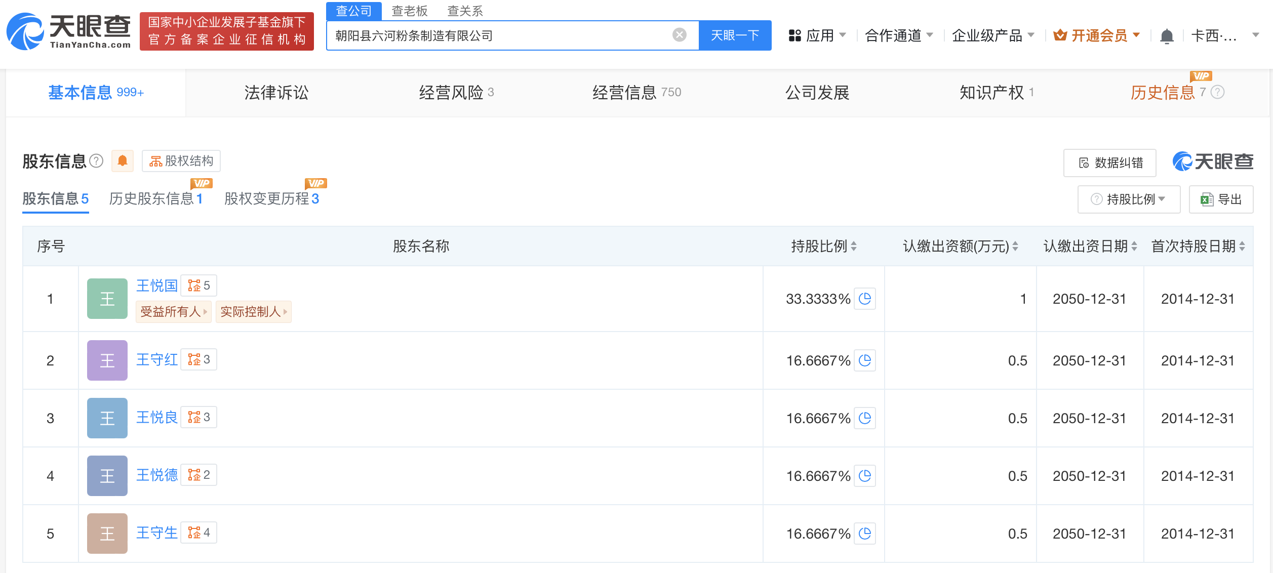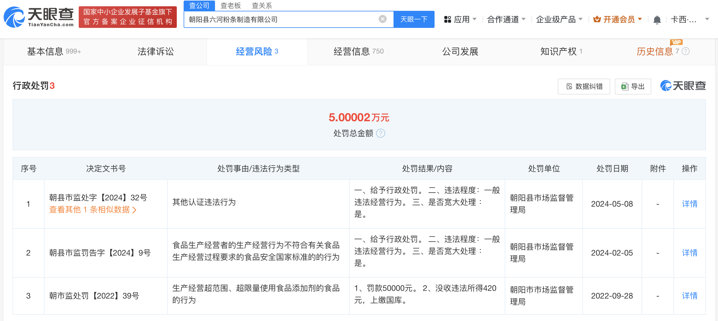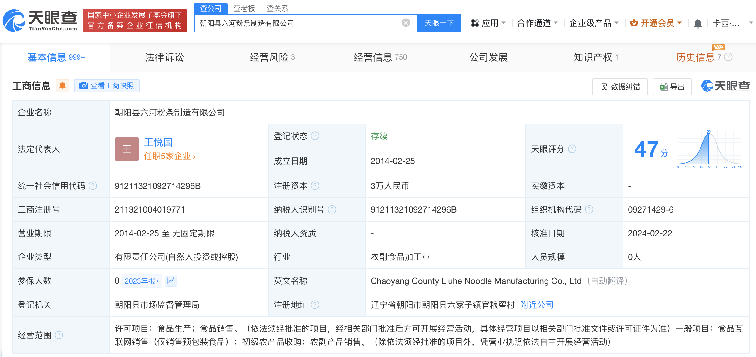 天眼查App显示,朝阳县六河粉条制造有限公司成立于2014年2月,法定代表人为王悦国,注册资本3万人民币,经营范围含食品生产、食品销售、食品互联网销售等,由王悦国、王守红、王悦良等共同持股。行政处罚信息显示,今年5月,该公司因伪造商品条码,被朝阳县市场监督管理局罚款1万元;2022年9月,该公司因生产经营超范围、超限量使用食品添加剂的食品的行为,被朝阳市市场监督管理局罚款5万元。此外,食品安全信息显示,2018年,该公司生产的粉条、红薯粉条曾两次被抽检出二氧化硫残留量不合格。年报信息显示,2023年该公司参保人数为0。