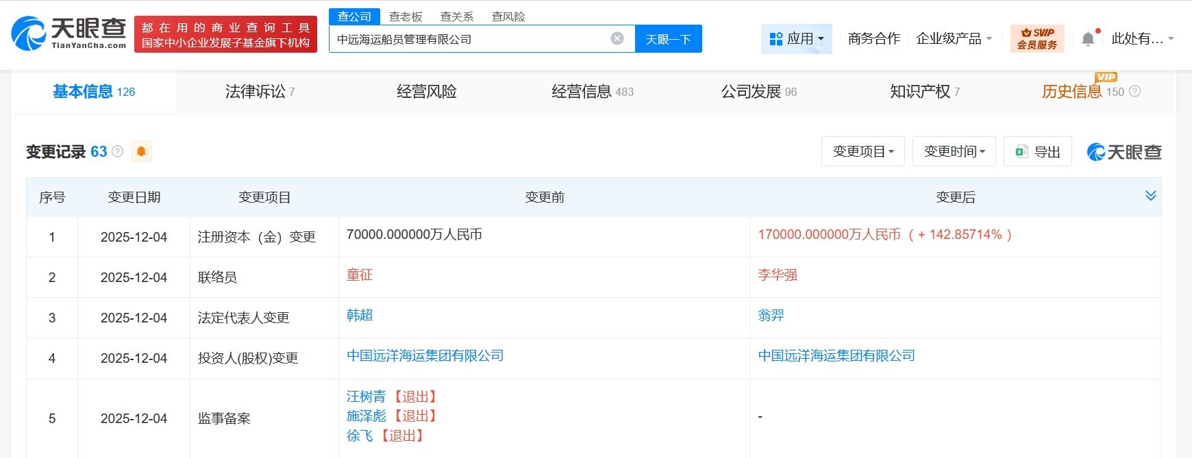 天眼查工商信息显示,近日,中远海运船员管理有限公司发生工商变更,韩超卸任法定代表人、董事长,由翁羿接任,注册资本由7亿人民币增至17亿人民币,增幅约143%,同时,多位高管发生变更。