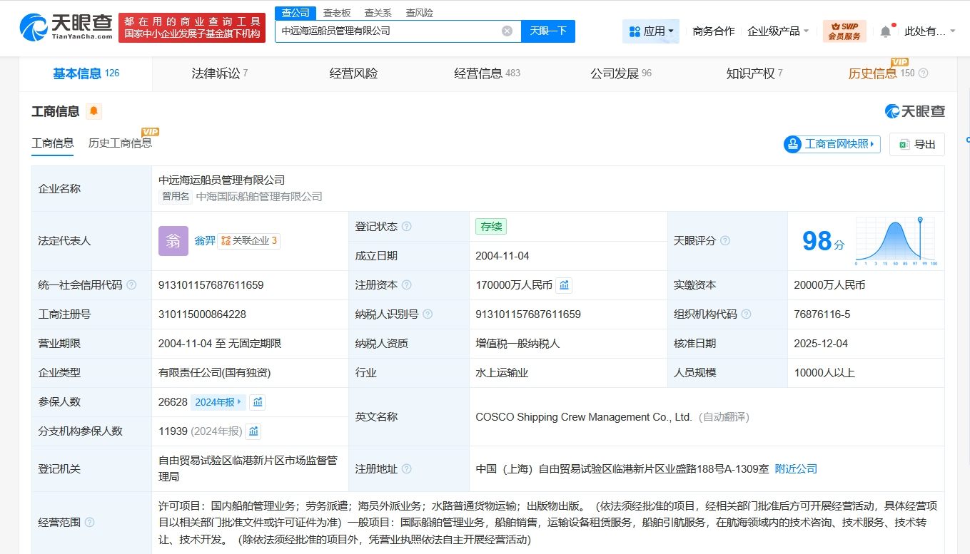 中远海运船员管理有限公司成立于2004年11月,经营范围含国内船舶管理业务、劳务派遣、海员外派业务、水路普通货物运输、出版物出版、国际船舶管理业务、船舶销售、运输设备租赁服务等。股东信息显示,该公司由中国远洋海运集团有限公司全资持股。