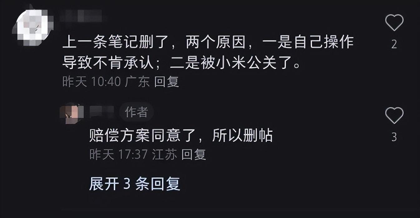 后续进展是经过市场监督局、小米汽车售后共同给了车主一个处理结果,车主同意赔偿法案,以删帖结束。