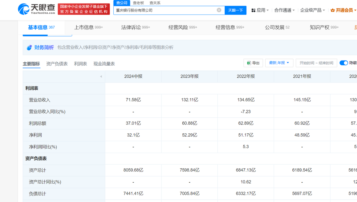 天眼查APP显示:今年上半年,重庆银行实现营收71.58亿元,同比增长2.62%;归属净利润30.26亿元,同比增长4.12%。
