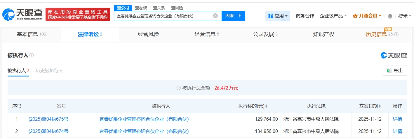 天眼查天眼风险信息显示,近日,宜春优唯企业管理咨询合伙企业(有限合伙)、桐乡同众投资管理有限公司新增两则被执行人信息,执行标的合计26万余元,执行法院均为浙江省嘉兴市中级人民法院。