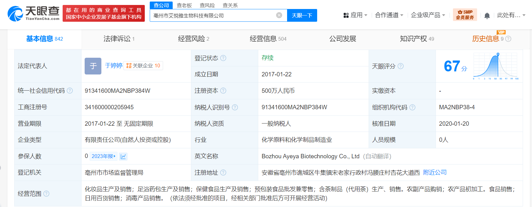 天眼查App显示,亳州市艾悦雅生物科技有限公司成立于2017年1月,法定代表人为于婷婷,注册资本500万人民币,经营范围含化妆品生产及销售、足浴药包生产及销售、保健食品生产及销售、预包装食品批发兼零售等,由于婷婷、冯猛共同持股。值得注意的是,2024年9月、12月,该公司均因其生产的消毒产品无法提供卫生安全评价报告,被亳州市卫生健康委员会共罚款1万元。