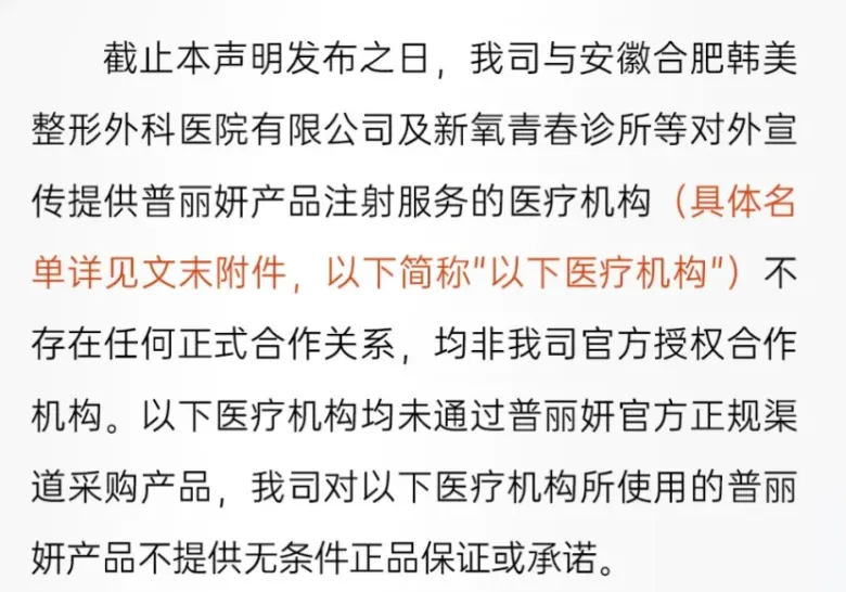 近日,童颜针厂商普丽妍的一纸公告,将医美行业暗流涌动的供应链矛盾彻底公开化。公告直指79家“非官方合作医疗机构”,其中新氧旗下46家青春诊所赫然在列,被标注为“黑名单医美机构”。普丽妍警告消费者,这些机构使用的产品可能“来源不明、真假难辨”,存在多重风险。