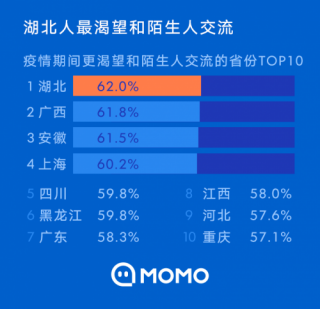从地域来看,广东、广西、江西、陕西、黑龙江、重庆、湖北、上海、贵州、河北等十个省市的网民比平时更孤独的比例位居全国前十;湖北、广西、安徽、上海、四川、黑龙江、广东、江西、河北、重庆等十个省市的网民比平时更渴望和陌生人交流的比例远高于全国其他地区。