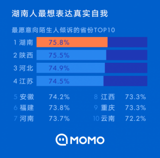我们一生遇到的大部分人,都是从陌生到熟悉。根据陌陌报告,近九成网友表示愿意和陌生人做朋友,其中意愿最强的十个省市均在南方,分别是福建、广西、重庆、广东、海南、上海、贵州、安徽、云南、江西,愿意和陌生人做朋友的网友比例分别为91.3%、90.3%、90.1%、89.9%、88.7%、88.6%、88.6%、88.5%、87.9%、87.3%,可见南方人比北方人更爱广交朋友。