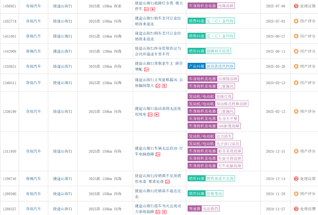 李先生的经历不是个案,在某短视频平台搜索“捷途漏水”,出现了数十个视频,大多都与捷途山海系列、捷途旅行者有关。据悉,李先生购买的捷途山海T1是一款插电混动的紧凑型SUV,指导价13.49-17.99万元,7月销量4350辆。在车质网上,捷途山海T1存在不少质量问题投诉,而且都是影响安全的大问题。比如一位车主投诉车辆在行驶中故障灯全亮熄火停车,还有一位车主投诉车辆在高速上出现过两次动力受限问题。