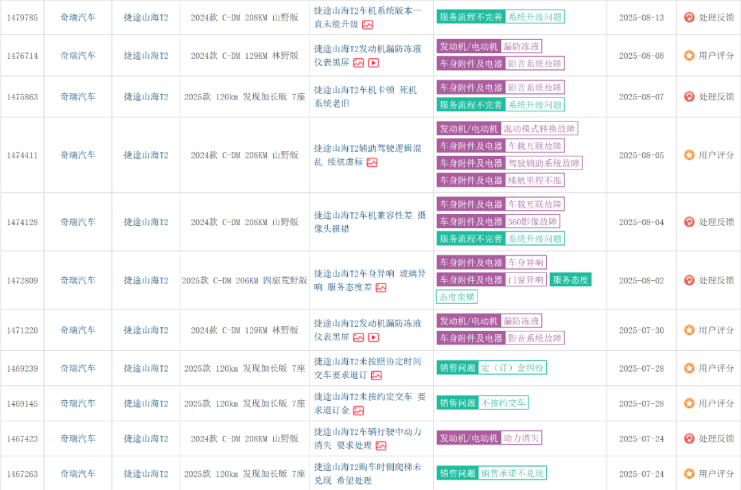 不光是捷途山海T1,捷途山海系列的T2、L7等车型同样存在不少质量问题投诉。在车质网上,捷途山海T2出现了发动机漏防冻液、车机卡顿死机、辅助驾驶系统故障、混动模式转换故障等投诉。捷途山海L7则出现了车身生锈、变速器跳档、刹车失灵、变速器无法加速等问题。