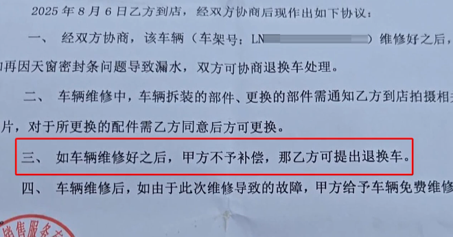 李先生立即联系了买车的南京捷途4S店,门店销售人员让李先生就近维修,检查后确认是天窗胶条脱落导致的漏水,但因为维修需要半个月,在外地不方便,李先生便返回了南京。8月6日,经过协商,李先生购车的捷途4S店承诺:车辆维修好后,如果天窗再因密封条问题漏水,可协商退车,如果4S店不予补偿,李先生可提出退换车。可李先生没想到,车修好后,4S店不仅不予补偿,还打算收回书面协议。