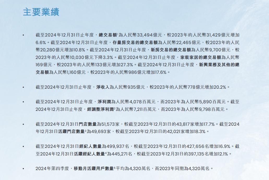 截至2024年12月31日止年度,总交易额为人民币33,494亿元,较2023年的人民币31,429亿元增加6.6%。