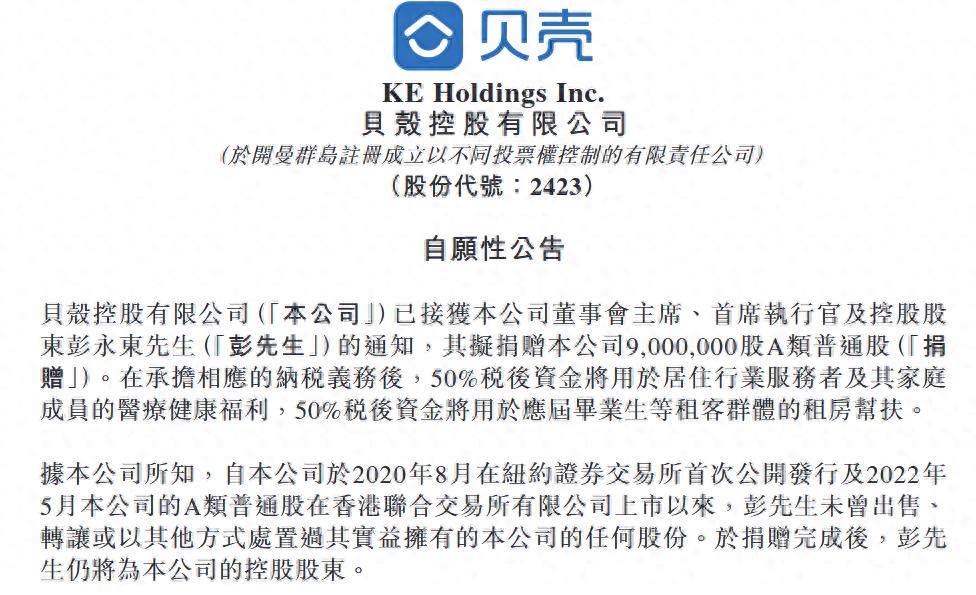 4月17日晚间,贝壳(HK:02423)发布公告,接获董事会主席、首席执行官及控股股东彭永东的通知,其拟捐赠900万股A类贝壳普通股。在承担相应的纳税义务后,50%税后资金将用于居住行业服务者及其家庭成员的医疗健康福利,50%税后资金将用于应届毕业生等租客群体的租房帮扶。